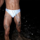 El Shiny Swim Thong está confeccionado con un tejido italiano con un sutil acabado metálico. Un tejido impermeable de moda con resistencia al cloro y al pilling. Diseñado para realzar los glúteos. Tres capas de forro para un soporte y cobertura frontal óptimos. Cordón personalizado con puntas del logo SAMMY .